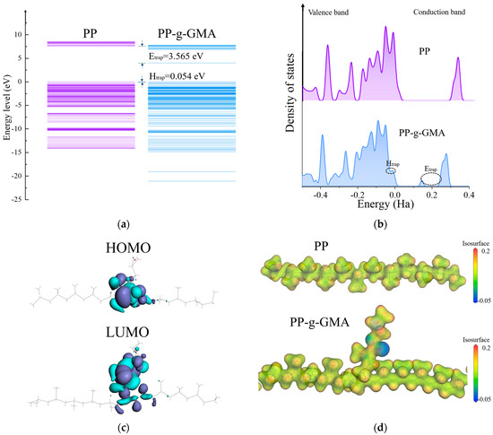 (a) Energy band structure. (b) DOS for PP and PP-g-GMA. (c) LUMO and HOMO molecular orbitals in PP-g-GMA. (d) Electrostatic potential distribution. Blue and red colors represent positive and negative potentials, respectively.