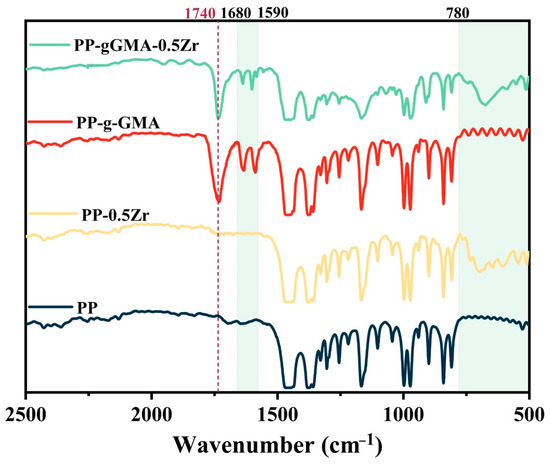 Figure 2 shows the infrared spectra of PP and modified PP. The differences in the curves of the four composite media are mainly concentrated in the range of 500~1800 cm−1, so the horizontal coordinate range is limited to 500~2500 cm−1. In comparison to pure PP, the infrared spectra of PP-g-GMA and PP-gGMA-0.5Zr exhibit the emergence of a carbonyl group stretching vibration band around 1740 cm−1. This provides evidence of a bonding reaction between GMA and the polypropylene backbone, indicating the successful grafting of GMA. The absorption peaks observed in the range of 1570–1680 cm−1 correspond to the stretching vibrations of C=C bonds [32], representing both symmetric and antisymmetric stretching. In this range, the absorption peaks of PP-g-GMA and PP-gGMA-0.5Zr are more pronounced, indicating an increase in the content of C=C bonds within the ternary mixture, further confirming the successful grafting of GMA. Furthermore, the changes observed in the spectra of PP-g-GMA and PP-gGMA-0.5Zr in the range of 500–780 cm−1 are primarily attributed to ZrO2, as the peaks associated with Zr-O bonds are located around 650 cm−1 [19].