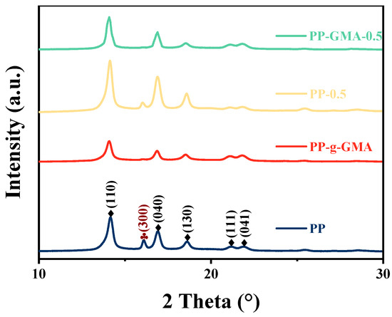 The crystalline structures of PP, PP-g-GMA, PP-0.5Zr, and PP-g-GMA-0.5Zr were analyzed using an X-ray Diffractometer (XRD, D8Advance, Bruker, Karlsruhe, Germany). Cu target was used as the X-ray source, with a scanning range of 2θ from 10° to 30°, a scanning step size of 0.0102°, and a dwell time of 0.1 s per step.