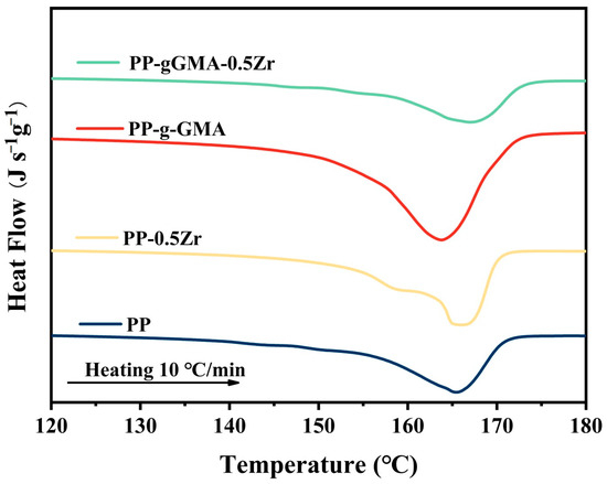 The melting behavior of PP, PP-0.5Zr, PP-g-GMA, and PP-gGMA-0.5Zr was investigated using DSC. The DSC thermograms during heating from 120 °C to 180 °C are shown in Figure 4. From Figure 4, it can be observed that the addition of ZrO2 slightly increases the melting temperature. This can be attributed to the reinforcement of the α phase, as the melting temperature of α phase is 165 °C, while that of β phase is 154 °C. On the other hand, the grafting of GMA onto PP leads to a slight decrease in its melting temperature, as observed from Figure 3, primarily attributed to the weakening of the α phase. Notably, the ternary system comprising PP, PP-g-GMA, and 0.5 wt% ZrO2 exhibits a higher melt temperature compared to other conditions. XRD analysis reveals the strengthening of the α phase and the reduction of the β phase, indicating the superior thermal stability of this ternary system.