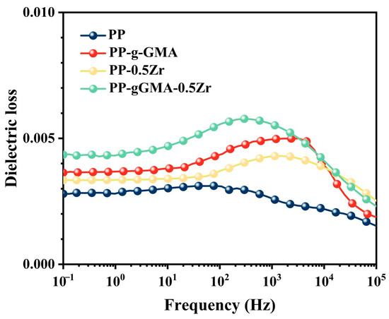 Dielectric loss of sample of neat PP, PP-g-GMA, PP-0.5Zr, and PP-gGMA-0.5Zr.