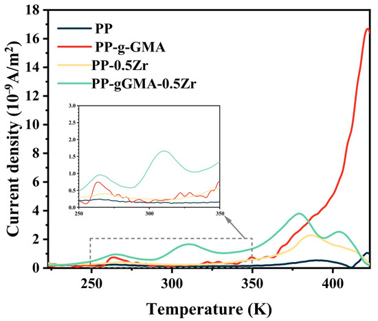 In Figure 7, the TSDC curves of four PP composite materials are shown. It is observed that all three modification methods result in an increase in the depolarization current. The current density of PP-g-GMA exhibits exponential growth after 350 K as depicted in the figure. In the TSDC experiment, there is a strong correlation between the current density and traps [30]. The high-temperature current peak is believed to originate from charge detrapping [34]. PP is a semi-crystalline polymer, and its charge traps arise from the amorphous regions and the crystalline–amorphous boundaries. Physical defects such as voids and pores introduce shallow traps, while chemical defects such as broken chemical bonds and polar groups give rise to deep traps [35,36,37,38]. The introduction of polar groups through GMA grafting leads to an increase in deep traps. The changes in deep traps induced by GMA grafting can also be observed in the results of molecular simulations, as shown in Figure 1a,b. Through molecular simulations, we investigated the trap changes upon grafting GMA onto a PP molecular chain. The calculations indicate that the introduction of GMA onto PP results in the introduction of higher energy level traps near 3.565 eV. These deep traps cause a sharp increase in current density at high temperatures. After doping with ZrO2, the depolarization current increases in the mid–low temperature range (<100 °C), which may be attributed to the introduction of more shallow traps. The peak positions of the depolarization current in the TSDC spectra are observed to be around 260 K and 315 K, which may be associated with the dipole reorientation polarization-induced glass transition, while the peaks in the high temperature region can be attributed to electronic traps.