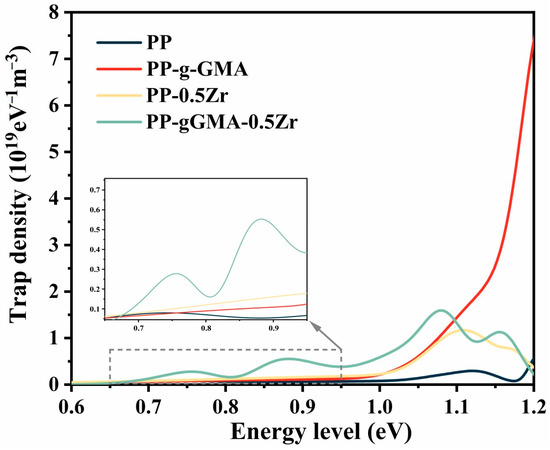 In accordance with the computational procedure outlined in reference [30], the trap distribution curves for the four polypropylene (PP) composite materials were computed, as depicted in Figure 8. In comparison to unmodified PP, all three modes of modification result in a significant increase in trap density. Notably, PP-gGMA-0.5Zr exhibits a more distinct peak within the energy range of 0.80–0.95 eV. The trap density of PP-g-GMA surpasses the other three samples at energy levels greater than 1.1 eV, while PP-gGMA-0.5Zr demonstrate the most pronounced enhancement of trap density within the sub-1.1 eV range. The abovementioned molecular simulations also corroborate the introduction of deep traps through the grafting of GMA onto PP.