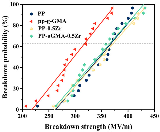 Weibull distributions of neat PP, PP-g-GMA, PP-0.5Zr, and PP-gGMA-0.5Zr.