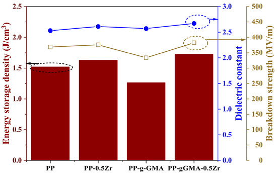 Energy storage density of neat PP, PP-g-GMA, PP-0.5Zr, and PP-gGMA-0.5Zr.