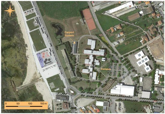 The case study under analysis is located at the Campus of the School of Technology and Management (ESTG) of the Polytechnic Institute of Viana do Castelo (IPVC), in the northwest region of Portugal. During the school period, the building is used by 2500 students and 181 staff members who support all teaching and research activities. The campus is composed of a set of buildings destined for teaching, research, and workshops, a library, and an exhibition, including two electricity delivery points designed for the whole campus. The photovoltaic system is currently integrated into one of these electricity delivery points, which is made up of two buildings; the main one consists of a four-story classroom building and a two-story workshop building including woodworking machines and a design lab. Most of these buildings were recently renovated to improve their energy efficiency, involving the thermal insulation of the envelopes, the replacement of the window frames, and the adoption of shading devices on the glazed openings to the south, east, and west. New high-performance equipment was applied to improve energy efficiency by replacing two ineffective boilers with two low-condensation, high-efficiency natural gas heaters. Additionally, a rooftop air-conditioning system was installed for the school auditorium acclimatization. All lighting systems were upgraded to LED technology, and a carport-type photovoltaic production system with a peak power of 102.8 kW was installed on campus. As represented in Figure 1, the photovoltaic installation is a carport solar panel racking system designed to be waterproof and to have high salt tolerance and strong corrosion resistance due to the proximity to the sea. The campus is placed next to the North Atlantic coastline.