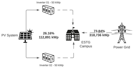 The use of photovoltaic (PV) solar energy for self-consumption has shown clear benefits in promoting a sustainable campus of Higher Education Institutions (HEIs) [1,2,3], especially in terms of the site’s carbon footprint reduction, energy costs reduction, or the possibility of reselling the electric energy generated to the national electricity grid when local regulation allows a situation of that kind. Solar panels are connected directly to the grid via inverters; therefore, the energy produced can be transmitted to the site for self-consumption, and, if possible, the excess can be sold to the national electric network and returned to the grid. There are, however, some situations in which the local grid operator does not allow the injection of electricity into the grid, shaping, therefore, a local network without authorization to export the produced energy that is designed to comply with the rules of a specific funding project or meet some specific regulation requirements. From the public energy supply network point of view, the injection of active energy is necessary to reduce pressure on the power grid and limit the reinforcement costs; however, the excess of locally produced energy is not always allowed to be exported. Based on this drawback, the question that needs to be answered is the following: what should be done when the site has excess power generation that cannot be injected into the grid, and how can different amounts of energy produced throughout the year be managed efficiently?