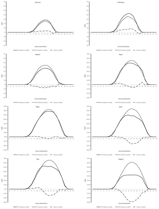 The graphs presented in Figure 4 show the 12-month production data of the 102.8 kWp photovoltaic system installed at the ESTG campus and the production estimate obtained using the PVGIS (Photovoltaic Geographical Information System) platform (available at https://joint-research-centre.ec.europa.eu/photovoltaic-geographical-information-system-pvgis_en, accessed on 15 March 2023) based on the data obtained between 2010 and 2020, as well as the balance between these two variables (PV production vs. PV prediction). The analysis of the results shows that when the balance is positive, production is higher than average, and when the balance is negative, it means that the production is lower than the value estimated by prediction. This scenario occurs mainly between March and December, due to the fact the electricity produced by the PV system is not injected into the grid. As expected, this value is higher in the summer months (June, July, and August), because electricity production increases with the solar radiation, and the consumption gradually falls with the end of the school year, reaching a minimum value in August, when the school is almost empty.