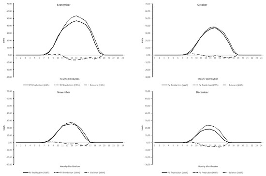 Distribution of production, prediction, and average monthly balance on an hourly basis.