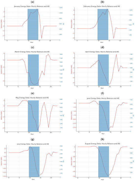 When analyzing the results, the integral absolute error (IAE) and standard deviation (SD) are metrics used to quantify errors and variability in data, respectively. The IAE for January is 1146.97, for February it is 1239.58, and for March it is 796.83. These values represent the cumulative absolute differences between consumption and production across each month, indicating that February had the highest imbalance, followed by January, with March being the most balanced month. The standard deviation for January is approximately 12.61, for February it is about 12.83, and for March it is around 13.47. These values measure the variability of the energy balance from the average for each month. A higher standard deviation indicates a larger spread of balance values around the mean. March shows the highest variability, which may be due to the presence of energy production data that slightly offsets the otherwise constant negative balance due to consumption. The IAE for April, May, and June are 696.89, 774.96, and 674.07, respectively. These values indicate that May had the highest total imbalance, suggesting that the energy system faced the largest cumulative shortfall between energy consumption and production during this month. The SD measures the dispersion of the balance values around their mean. The SDs for April, May, and June are approximately 27.70, 32.30, and 27.79, respectively. The higher SD in May corroborates with the IAE findings, suggesting that not only was the imbalance greater in May, but the fluctuations in the balance were also more pronounced compared to April and June. This could imply more variability in either consumption patterns or production output or both during May. Overall, these metrics suggest that the energy system’s performance was most erratic in May, with both higher discrepancies and greater variability in the energy balance. For July, the IAE was calculated at 782.96, indicating the total magnitude of the energy deficit over the month. The SD was 34.87, reflecting the variability in the hourly balance. August showed an improvement with a lower IAE of 638.39 and a smaller SD of 27.69, suggesting a more consistent and closer energy balance between consumption and production. In September, while the IAE increased slightly to 766.03 compared to August, the SD remained relatively similar at 27.83, indicating stability in the balance fluctuations despite the higher total deficit. The reduction in the IAE from July to August implies an overall improvement in the balance, which is possibly due to better energy management or increased production. The consistency in the SD between August and September, despite a higher IAE, might suggest that while the overall deficit increased, the balance did not become more volatile, which could be seen as a positive aspect of energy management for those months. In October, the IAE was 929.20, which reflects the sum of absolute differences between production and consumption. For November, this value slightly increased to 1020.69, suggesting a larger overall imbalance. December showed a reduction in imbalance, with an IAE of 865.09. October had the highest SD at 17.33, indicating that the balance values vary more widely from the mean compared to the other months. November and December had lower SDs of 11.94 and 8.22, respectively, suggesting less fluctuation in the balance values. November had the highest total imbalance, while December had the least. The month of October showed the most variability in its energy balance, whereas December was the most consistent. These results suggest that the energy system’s performance varied, with November being the most challenging month in terms of managing the balance between consumption and production. The results are summarized in Table 2 and schematically presented in Figure 5.