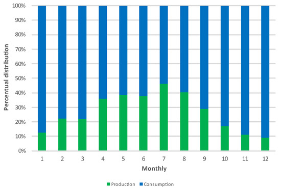 The installation of renewable energy systems to produce electricity for self-consumption, as is the case of the situation under analysis in this article, presupposes that the photovoltaic system installed can offset at least a significant part of consumption since this is the only possible way to amortize the investment made by reducing electricity costs. From a purely economic analysis of the situation, it seems that the total estimated PV energy produced corresponds to 26.1% of the campus consumption on average (Figure 6). In a first analysis, this value seems to be relatively reduced due to several factors: there is high energy consumption on the campus during the non-production period, at night, and in some specific periods of the year, energy consumption is lower than the energy production, so the potential production is not at its maximum because the installed system is designed without grid injection, and, based on this, the system’s inverter cuts and blocks energy production according to the consumption profile.