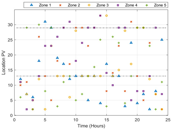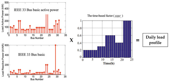 According to [45], the fundamental active and reactive powers of the loads are reported. However, at different parts of the day, the load profile is not reported. In order to construct a daily load profile, a time-based factor (HBFt) should be added to the base-load data. Figure 3 shows how this factor will be altered throughout the day to reflect the load profile during peak and off-peak periods, and the large-scale PV farm’s anticipated daily average electricity output was also considered. However, in many situations, the load and power generation profiles can also be taken into account. The active and reactive powers of the th bus at the th time step are determined as shown in Equations (16) and (17):