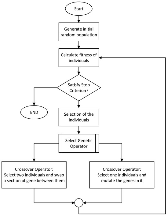 The genetic algorithm in Figure 4 is an optimization algorithm inspired by the process of natural selection in biology. GAs are commonly used to solve optimization problems where the solution space is very large, complex, or difficult to evaluate using traditional optimization techniques [47]. The basic idea behind GAs is to establish possible solutions to the optimization problem and then use operations like selection, mutation, and crossover to move the population toward a better solution.