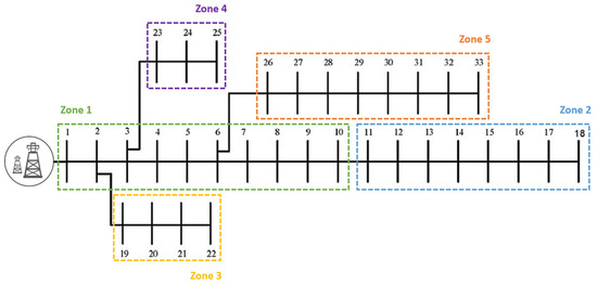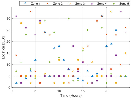 In zone 5, the optimal EVCS position in bus 30, the optimal PV position in bus 29 totaled 453.1764 kWp, and the optimal BESS position in bus 5 totaled 83.1685 kWh, with a total voltage of 0.9461 p.u. and a total power loss of 203.8362 kW.
