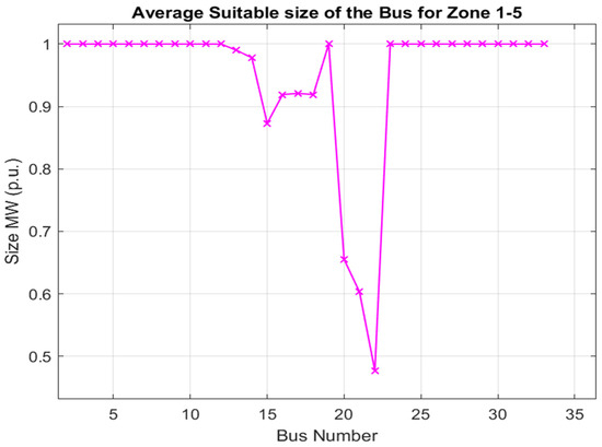 The simulation results from the IEEE 33 bus test are shown in Table 3. The EVCS 200 kW installation was zoned with the optimal sizing and location of PV and BESS (bus 2 to bus 33), with a total voltage of 0.9448 p.u. and a total power loss of 301.9726 kW, and the results of the zoning simulation are as follows: