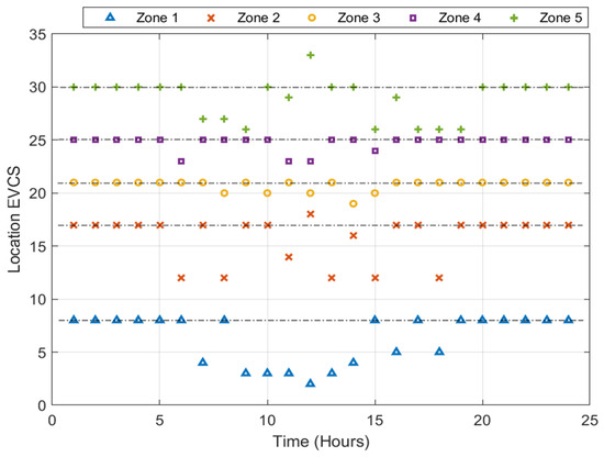 Figure 14 depicts the location-based deployment of electric vehicle charging stations (ECVSs) using “GA case zones 1–5”, which most likely entails designing and carefully positioning charging stations for electric cars. Each of the five zones, denoted by the numbers 1 through 5, probably represents a particular region with a range of features, including population density, transportation facilities, and the adoption of electric vehicles. This location-based method aims to guarantee effective coverage of EVs and accessible EV charging infrastructure throughout the nation. Authorities may identify the best places for an EVCS in each zone by examining traffic patterns, charging demand, and current charging infrastructure. This tactical move lessens range jitters, encourages eco-friendly mobility alternatives across the state, and supports the increased use of electric vehicles.
