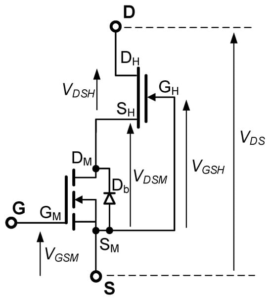 The GaN-FET can operate in one of four operating ranges: the partial cut-off range, the full cut-off range, the conduction range, and the inversion range [,,,]. In the partial cut-off range, when the gate-source voltage is lower than the MOS transistor threshold voltage (VGSM < VTHM), and at the same time, when the (negative) gate-source voltage of the HEMT is higher than the threshold voltage of this transistor (VGSH = −VDSM > VTHH), the current flowing between the drain and source of the GaN-FET cascaded circuit is only blocked by the MOS transistor. The GaN-FET usually operates in the partial cut-off range when it is controlled by a drain-source voltage VDS of a relatively low value, which does not effectively cut off the channel of the HEMT.