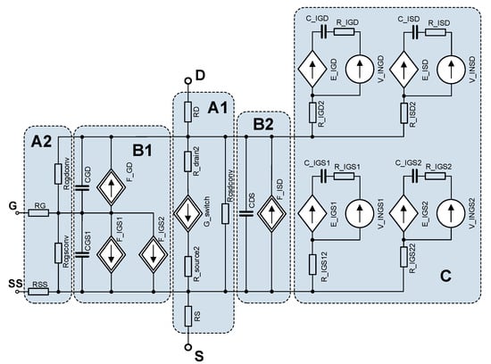 In Section 3.1, Section 3.2 and Section 3.3, the forms of GaN-FET models offered by individual manufacturers are presented and discussed. To increase the readability of the schematic diagrams, individual model elements have been grouped into functional blocks labeled with letters A, B, C, etc.