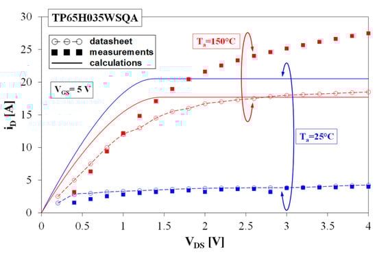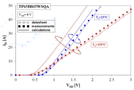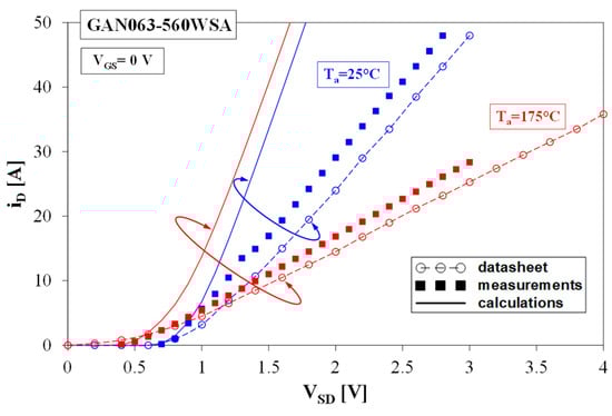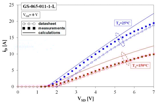 As seen, an acceptable agreement between the measurement and simulation results was obtained only for Transphorm’s transistor operating at a temperature of 25 °C and for the GaN Systems transistor at both considered ambient temperatures. It is worth noting that in Transphorm’s transistor and Nexperia’s transistor, the characteristics of the body diode at temperature 25 °C and the elevated ambient temperature intersect at the operating point at VDS of about 1 V, which is not observed in other field-effect transistors containing a similar body diode (e.g., MOSFETs).