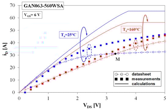 As can be seen, a relatively good agreement between simulation and measurement results was achieved only in the case of the GaN Systems transistor model at both considered ambient temperatures (Figure 7). The value of the RMS error does not exceed 12%. On the other hand, the Transphorm and Nexperia transistor models reproduce the characteristics of the tested transistors (Figure 5 and Figure 6) incorrectly—there are significant quantitative differences between the calculation and measurement results, and the RMS error values reach approximately 260% and 50%, respectively. Despite this, all the considered semiconductor devices in the study are of the same type (GaN-FET), and it can be observed that the increase in ambient temperature can affect the output characteristics of these devices in two ways. For example, in Transphorm’s transistor, an increase in ambient temperature causes an increase in the drain current at constant values of VGS and VDS, while in the GaN Systems transistor, a decrease in the drain current with increasing ambient temperature can be observed. Apart from this, the dual nature of changes in the values of drain current due to temperature changes is also visible on the datasheet characteristics of Nexperia’s transistor. Therefore, at the operating point with VGS = 6 V and VDS = 3.5 V (point M marked in Figure 6), the temperature does not affect the values of the drain current. This point can therefore be called the thermal compensation point.