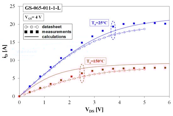 In the following part of the chapter, the output characteristics iD(VDS) and the transfer characteristics iD(VGS), as well as the temperature dependencies of two parameters, namely the on-resistance RON(T) and the threshold voltage VTH(T), are considered. In the figures presented in this chapter, the solid lines represent the results of calculations, the unfilled points connected by a dashed line represent the catalog characteristics, and the filled points represent the results of the authors’ measurements. The accuracy of the models was evaluated based on the calculated value of the root-mean-square (RMS) Error.