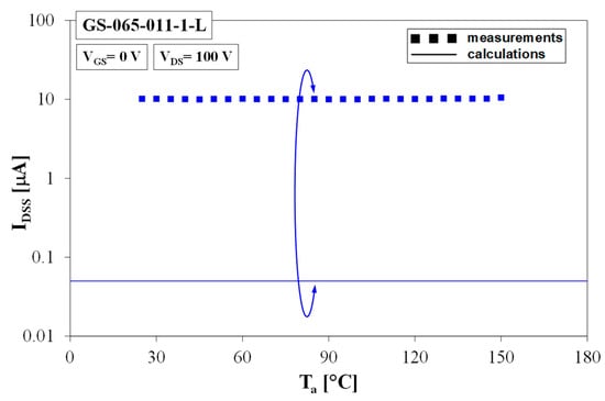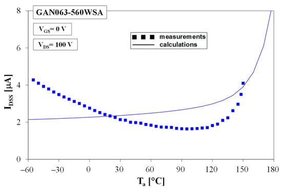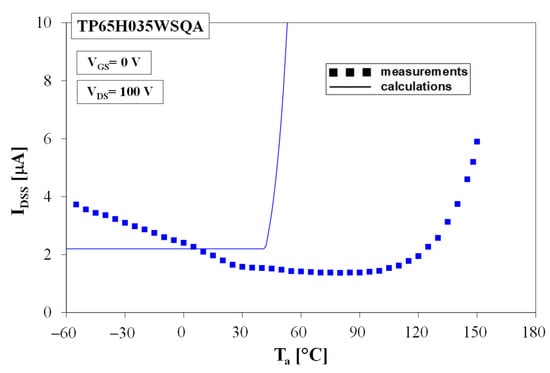 As seen, significant discrepancies between the simulation and measurement results were obtained for each transistor, which in the case of the GaN Systems transistor can reach up to two orders of magnitude. The measured temperature dependences of IDSS for Transphorm’s and Nexperia’s transistors are nonlinear functions with a minimum located around a temperature of 100 °C, while the IDSS(T) dependence of the GaN Systems transistor is approximately constant throughout the entire range of changes in ambient temperature.