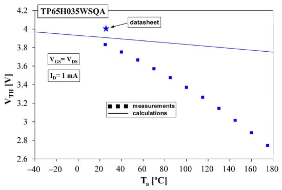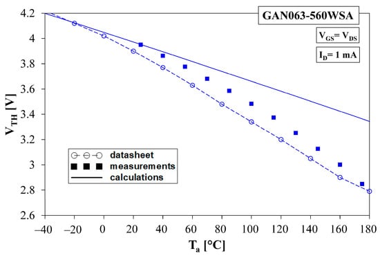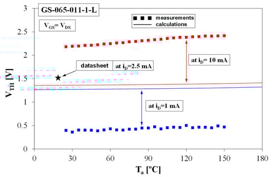 Figure 14, Figure 15 and Figure 16 show the ambient temperature (Ta) dependence of the threshold voltage VTH of the considered transistors. The values of this parameter shown in these figures were determined for standard conditions specified in the datasheets of the studied transistors, i.e., at VGS = VDS and ID = 1 mA, and for the GaN Systems transistor also at ID = 10 mA.