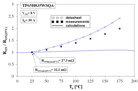 As seen, a very good agreement between the simulation and measurement results was achieved for all transistors only at a temperature of 25 °C. It should be emphasized that the results presented in Figure 17, Figure 18 and Figure 19 relate to normalized values of RON, while the calculated and measured real values of RON for the tested transistors at 25 °C (indicated in Figure 17, Figure 18 and Figure 19) differ by even more than two times.