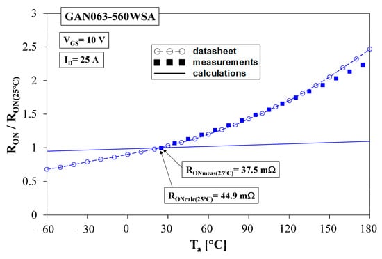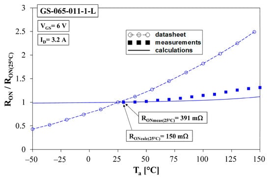 Measured, calculated, and catalogue RONnorm(T) dependence of the GaN Systems transistor.