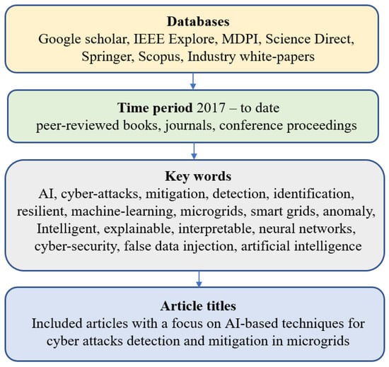 Figure 3. The flow chart depicts the process of selecting articles for this research. - The existing techniques are divided into two main categories, i.e., cyber attack detection and mitigation. The system under study, attack type, data acquisition, and training method of AI-based techniques are summarized in tables for each category.