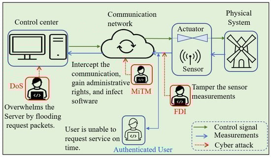 Microgids’ interoperability requires the use of numerous information exchange protocols and communication architectures, which could leave the system prone to cyber-attacks due to insufficient information []. Figure 4 depicts several cyber-attacks targeting the cyber and physical layer in a microgrid, and an overview of these types of cyber-attacks targeting microgrids is covered below.