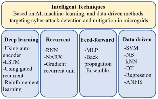 The learning capability of AI-based techniques enables them to estimate the parameters of complex systems, making them suitable for microgrid applications. Various types of artificial neural networks (ANNs), such as the adaptive linear neuron, multi-layer perceptron, feed-forward neural network, Elman neural network, radial basis function network, general regression neural network, and deep neural networks, are in use to design resilient control for microgrids to withstand cyber-attacks []. This work specifically focuses on AI-based techniques for cyber-attack detection and mitigation in microgrids. Some of the main contributions of this work are as follows: