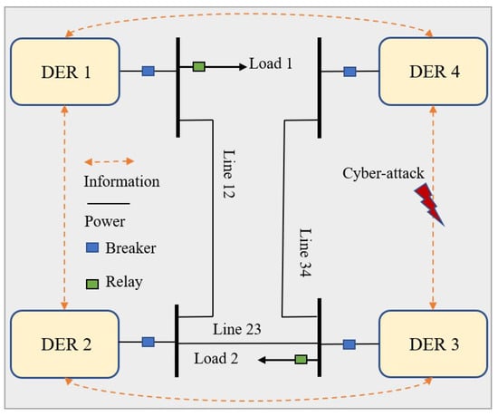 The test microgrid in this case study consists of four DERs coupled through RL lines to provide power to two RL loads. This microgrid is designed in MATLAB Simulink with a distributed cooperative control-based secondary controller. The design parameters of the microgrid are given in Table 6. Further details regarding distributed cooperative control design and system parameters can be found in [,]. The DERs share voltage and frequency information over the communication network to meet the control objectives.