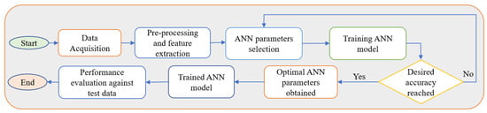 where is the model output, is the model input at discrete time interval k, is input memory order, and is output memory order. AI-based model development involves three main steps including data acquisition, training of the model, and performance evaluation using standard metrics as shown in Figure 7. This model development process is established from the state of the art, and has been effectively implemented in the power systems domain [].