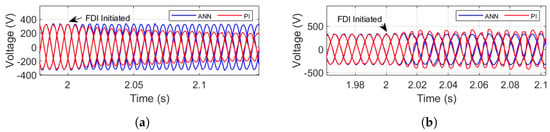 After the FDI attack, the proposed NARX ANN-based control is compared to the PI-based control, with the results depicted in Figure 8. As illustrated in Figure 8a, the proposed controller maintained the required output voltage at the output of DER2 after the initiation of the FDI cyber-attack. Similarly, after the FDI cyber-attack, the NARX ANN-based voltage controller maintained the specified output voltage at the output of DER3, as shown in Figure 8b. The proposed NARX ANN-based distributed secondary control has demonstrated improved reference tracking capabilities compared to the PI-based control under cyber-attack, as shown in Figure 8.