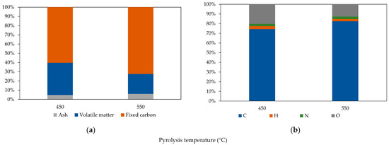 Values of the (a) proximate and (b) elemental analysis of biochar produced at 450 °C and 550 °C.