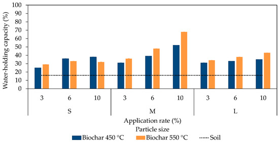 The water-holding capacity (WHC) values for the small-, medium-, and large-sized biochar particles incubated in the soil at application rates of 3%, 6%, and 10% (w/w) are shown in Figure 2.