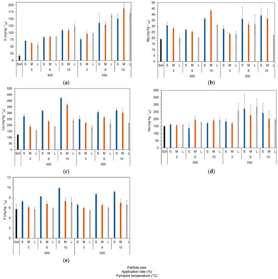 The values of the bioavailable plant nutrient elements P, Ca, Mg, Na, and K for all treatments are presented in Figure 4. The P concentration, Figure 4e, increased for all the treatments except for the 3% (w/w) application rate with particle size L at both biochar temperatures. In turn, the P concentrations in the remaining treatments increased by between 4 and 72%, with the greatest increase corresponding to a 10% (w/w) application rate of particle size L of the 450 °C biochar with a value of 9.85 mg∙kg−1db. The P concentration was directly proportional to the application rate and biochar particle size. The single effects of application rate, particle size, and the interaction between the particle size and application rate were statistically significant, with the particle size and application rate having the highest effect on its variance (partial eta squared of 0.822 and 0.883, respectively).