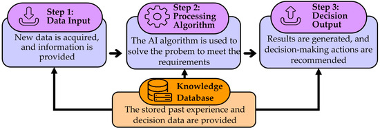 - Step 3 (Decision output): Through the processing algorithms, the output decision provides a judgment, choice, or action [43,44,45].