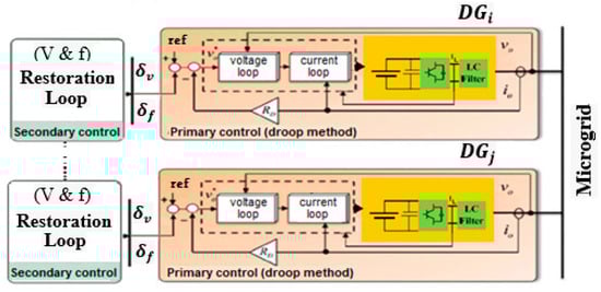 The SC level serves as a crucial factor in facilitating the reliable, secure, and cost-effective operation of the MG. During the MG’s steady-state operation, the SC mechanism oversees bringing the frequency back to its set value and making up for any changes in the primary level. AC MGs have pinned DGs and followed DGs. The main goal of SC in AC MGs is to achieve frequency recovery and power sharing.