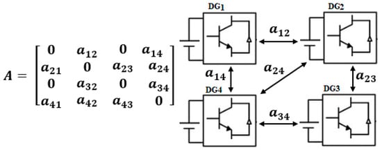 The communication layer between distributed generators (DGs) is denoted by a weighted G(), where = {1, …, n} represents the labels assigned to the DGs, is the set of communication links between the DGs, and A is the weighted adjacency matrix of the graph. The elements of the adjacency matrix, ≥ 0, are non-negative. The existence of an element signifies that node transmits information directly to node , where . The adjacency matrix is a mathematical representation used to describe the connections or relationships between vertices in a graph. The sparsity pattern serves as a representation of the communication layer’s architecture. Figure 3 is shown herein as a visual representation of the communication topology and adjacency matrix pertaining to four DGs, with the sole intention of providing a demonstrative context [38].