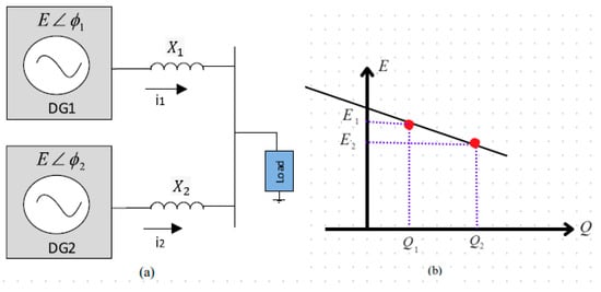 The achievement of accurate allocations of reactive power among DG units presents challenges due to multiple factors. Firstly, in contrast to frequency, voltage does not possess a universal characteristic, hence making its regulation more difficult [34]. In the simple MG system shown in Figure 4a, the variations in voltage and impedance across DG units, as illustrated in Figure 4b, pose a significant challenge in achieving precise reactive power sharing through Q-E droop management.