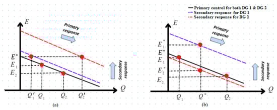 In a scenario where there is a lack of secondary control, inverters function at voltages and , while simultaneously injecting reactive powers and . Given that is not equal to , it may be concluded that there is an absence of reactive power sharing, which is sometimes referred to as the effect of the line impedance. The use of voltage-regulating SC guarantees the restoration of both DG voltage magnitudes. Nevertheless, it is important to acknowledge that the power injections of the inverter undergo a change from to a value less than , and from to a value greater than . As a result, the utilization of conventional SC further amplifies the existing deficiency in the distribution of reactive power among the DGs, as seen in Figure 5a.