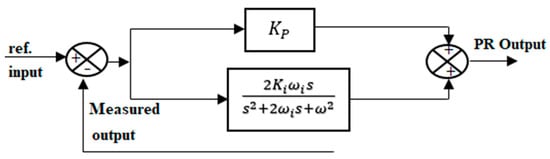 In recent years, there has been a noticeable rise in the use of PR controllers. The droop controller that is presented is founded on the reference frame. The control loops encompass proportional plus resonant (PR) terms that are adjusted to the fundamental frequency. This is mostly because PR controllers can effectively reduce the steady-state error that comes with sinusoidal signals. Furthermore, the controllers have garnered attention as suitable options for MGs due to their simple implementation, ability to compensate for low-order harmonics, and capacity to do so without impacting system dynamics or overall bandwidth. The utilization of a PR controller for the purpose of voltage harmonic removal in DG interface inverters is employed. Figure 6 depicts the execution of the PR control scheme. The math modeling of an ideal PR controller may be characterized as [39]: