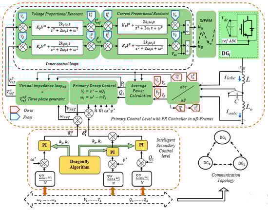 represent the average DGs voltage and represents the average DG reactive power. The objective is to achieve accurate error minimization by adjusting the proportional and integral gain parameters ( and ) of the PI controllers. This adjustment aims to minimize the discrepancy between the reference signal and the fault signal. Figure 8 shows the whole proposed control system (SDCC), which includes voltage and current with proportional resonant controller, droop controllers, virtual impedances in stationary reference frames, intelligent SDC control, and the communication topology proposed.