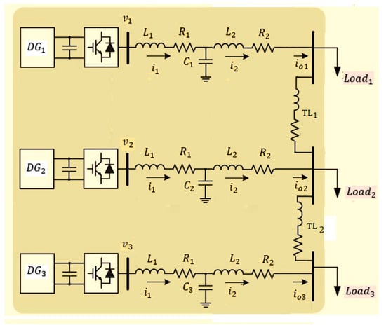 In this analysis, we will examine an AC MG system that is comprised of N DGs operating on alternating current (AC) and utilizing inverters. Every DG is equipped with its own primary controller that operates in a decentralized manner. The basic controller is composed of three distinct components, namely a droop control loop and a voltage/current control loop. Figure 1 illustrates the schematic diagram depicting an inverter-based DG. The droop control loop exerts a substantial influence on the overall performance of the primary control system, although the stability of the voltage and current loops remains intact. The primary control level, also referred to as droop control, is of paramount importance in maintaining voltage and frequency stability inside the MG. Additionally, it establishes the reference values for the control loops of voltage and current. The correlation between active power and frequency in DGs can be mathematically represented as follows [28]: