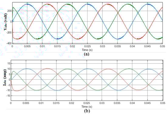 Three-phase system response: (a) output voltage, (b) output current waveform.