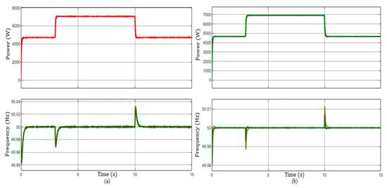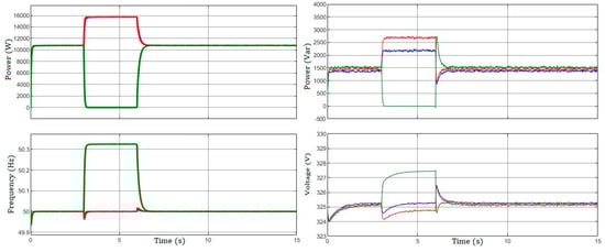 Figure 11 illustrates the MG transient response under continuous operation of the secondary control. The constant loads are being operated at and , while the additional local load at is introduced at t = 3 s and subsequently disconnected at t = 10 s. It should be noted that the frequency is restored in both instances. The MG, being a compact power electronics-based technology, exhibits a quicker response compared to typical centralized techniques. The observed phenomenon is characterized by a gradual return to the expected frequency and amplitude. By analyzing the frequency dynamics shown in Figure 11, the frequency variation encountered under primary droop control is swiftly mitigated by the SDCC approach that is detailed in Section 4 of this research article. Consequently, the SDCC controller effectively ensures consistent frequency regulation during load variations while minimizing any transient effects.