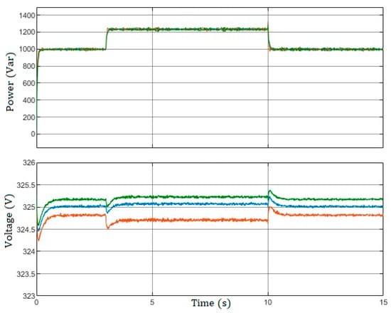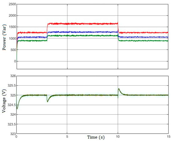 The examined situation, in which the coexistence of optimal reactive power sharing and inefficient voltage control is addressed, highlights the flexibility and resilience of the technique we suggest. In this scenario, the control system places emphasis on the effective distribution of reactive power resources among different components of the grid, therefore guaranteeing the prompt availability of reactive power in areas where it is most required. In contrast, Figure 13 illustrates the outcomes obtained from the implementation of the suggested SDCC controller, which has been fine-tuned to facilitate power sharing (with = 0), without including any measures for voltage regulation, as in Section 3.2. Although the sharing of reactive power is precise, there is a deviation in the voltage magnitudes from their nominal values, denoted as = 325.2 V.