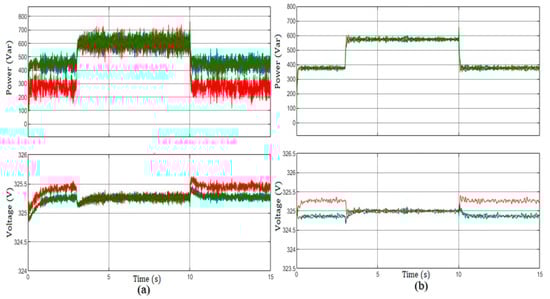The line impedance effect makes it hard for the voltage droop controller (Equation (12)) to divide reactive power demand among parallel–identical inverters in an efficient way. In a previous study [17], a different primary droop controller was suggested to deal with this problem. The goal was to achieve reactive power distribution across parallel inverters with the same rated voltages. Furthermore, the distributed voltage controller, as described in [37], requires the establishment of direct communication among all DGs. But, because the controller’s job is to keep the voltages of DG systems at their nominal values, it cannot distribute reactive power well between different units that are connected by lines with different impedances. Figure 2b illustrates the SC implementation that was employed to mitigate the voltage variation resulting from the operation of the droop controller.